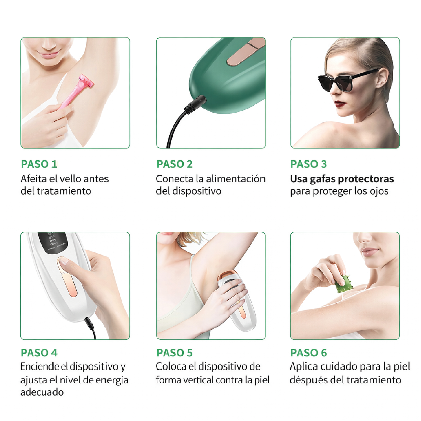 Cuenta con tecnología de luz pulsada, 5 niveles de energía, modo manual y automático y una larga vida útil de hasta 999,999 disparos. Ideal para cuerpo, piernas, brazos, axilas, bikini y rostro. Rápida, segura y fácil de usar.